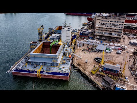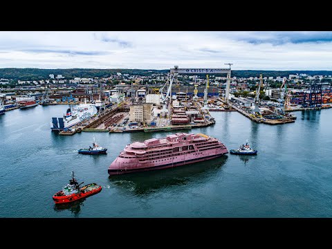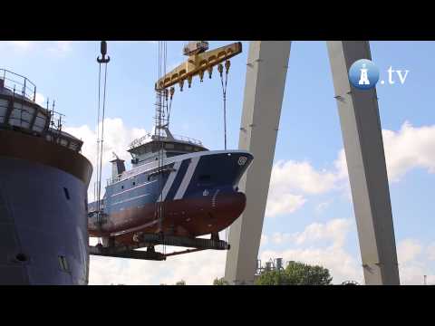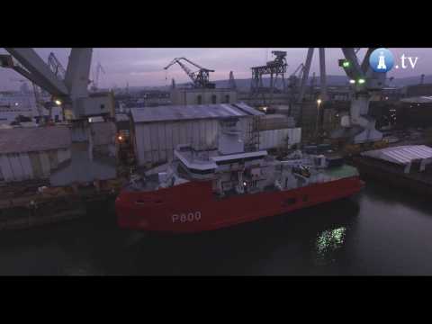 Wodowanie nowoczesnego statku polarnego C 325 Pirou w stoczni CRIST